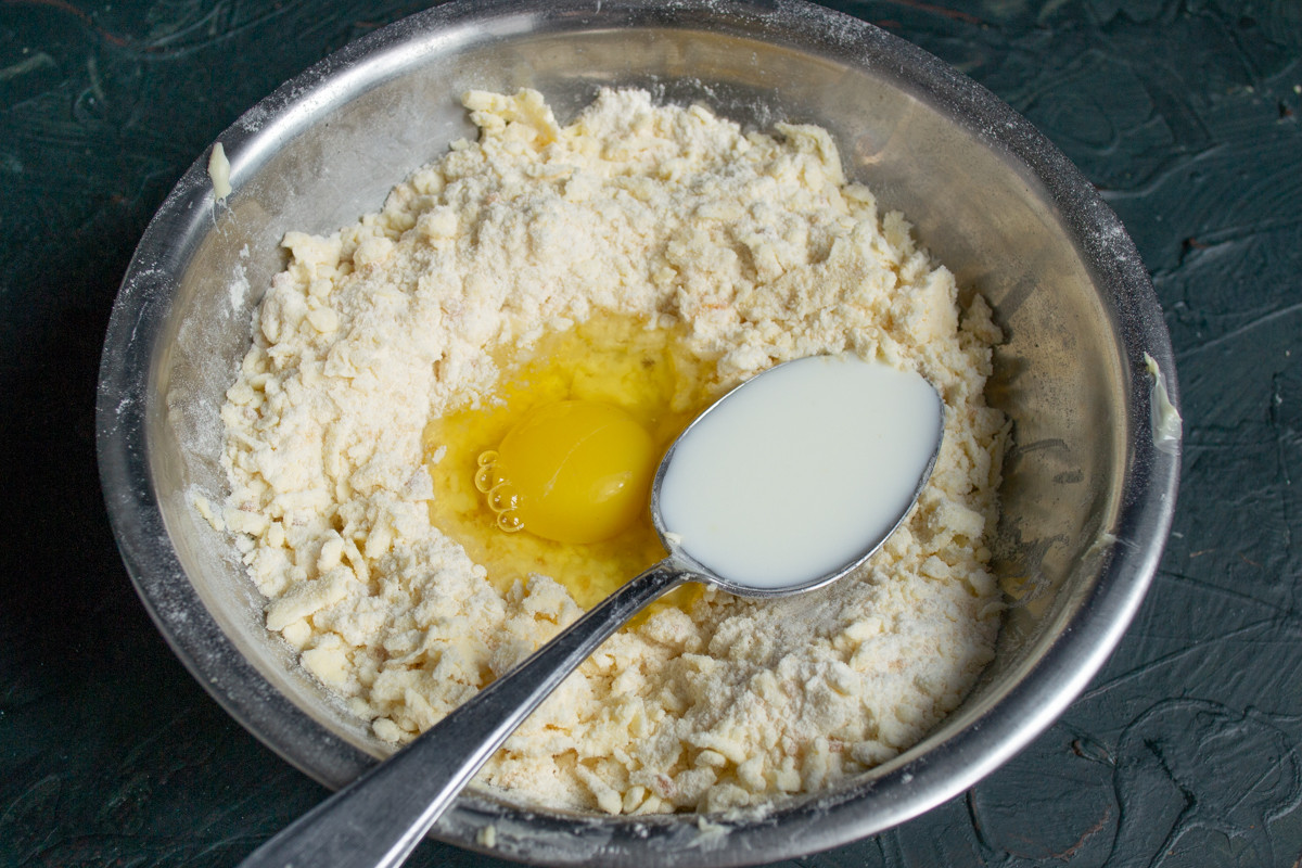 К сухим ингредиентам добавляем куриное яйцо, холодную воду, ванильный экстракт и щепотку мелкой соли. Быстро замешиваем тесто до однородного состояния, если получается очень тугим, можно добавить немного воды, если чересчур мягкое, то немного муки.
