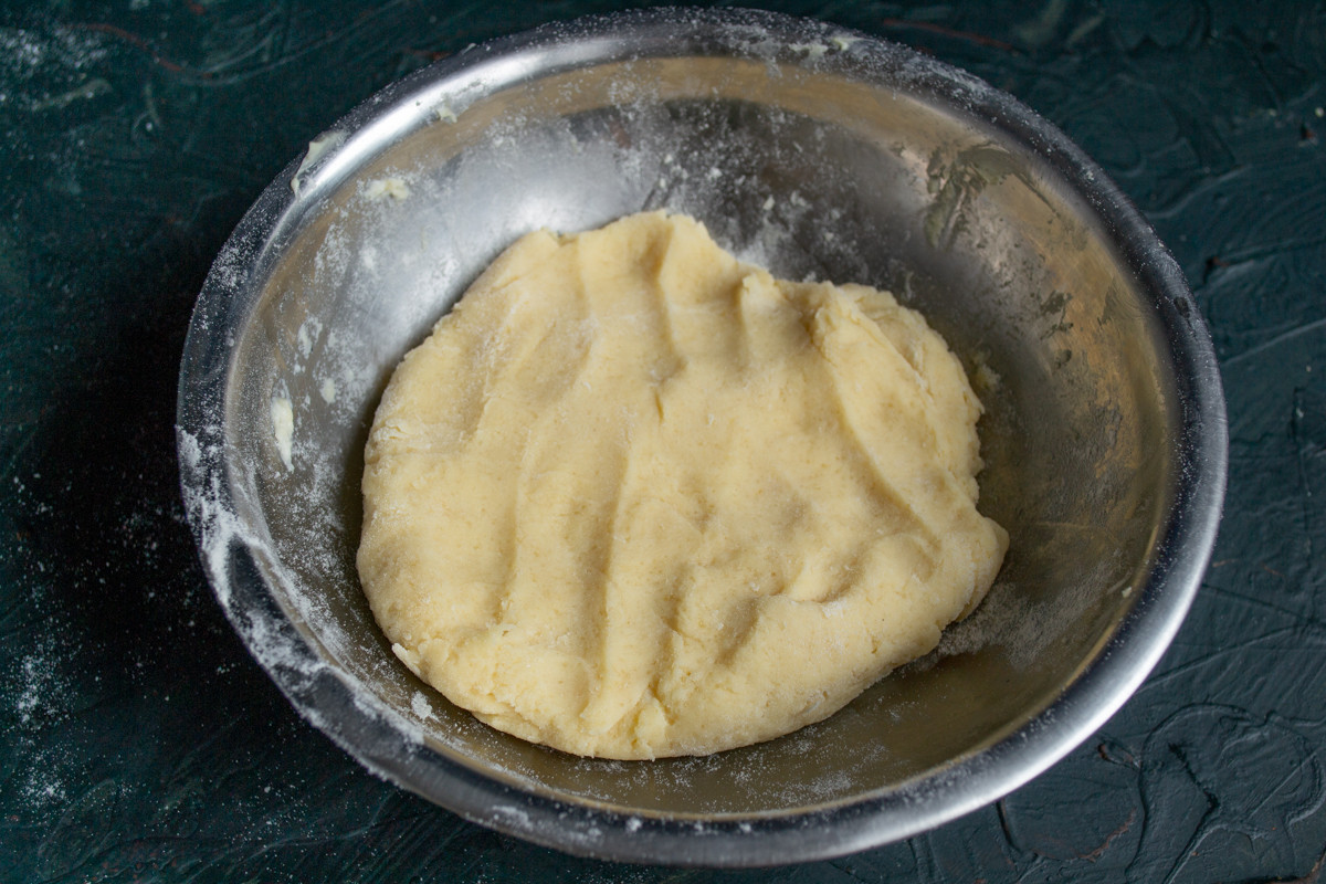 Делаем из теста лепешку толщиной около сантиметра, заворачиваем в пищевую плёнку и убираем в холодильник на 40 минут.