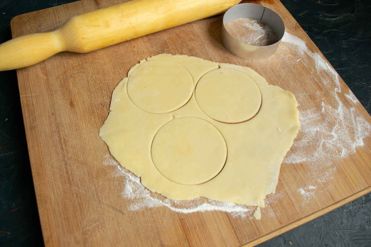 Охлаждённое тесто раскатываем на посыпанной мукой доске тонко. Вырезаем формочкой или стаканом из тонкого стекла кружочки диаметром 9-11 сантиметров.