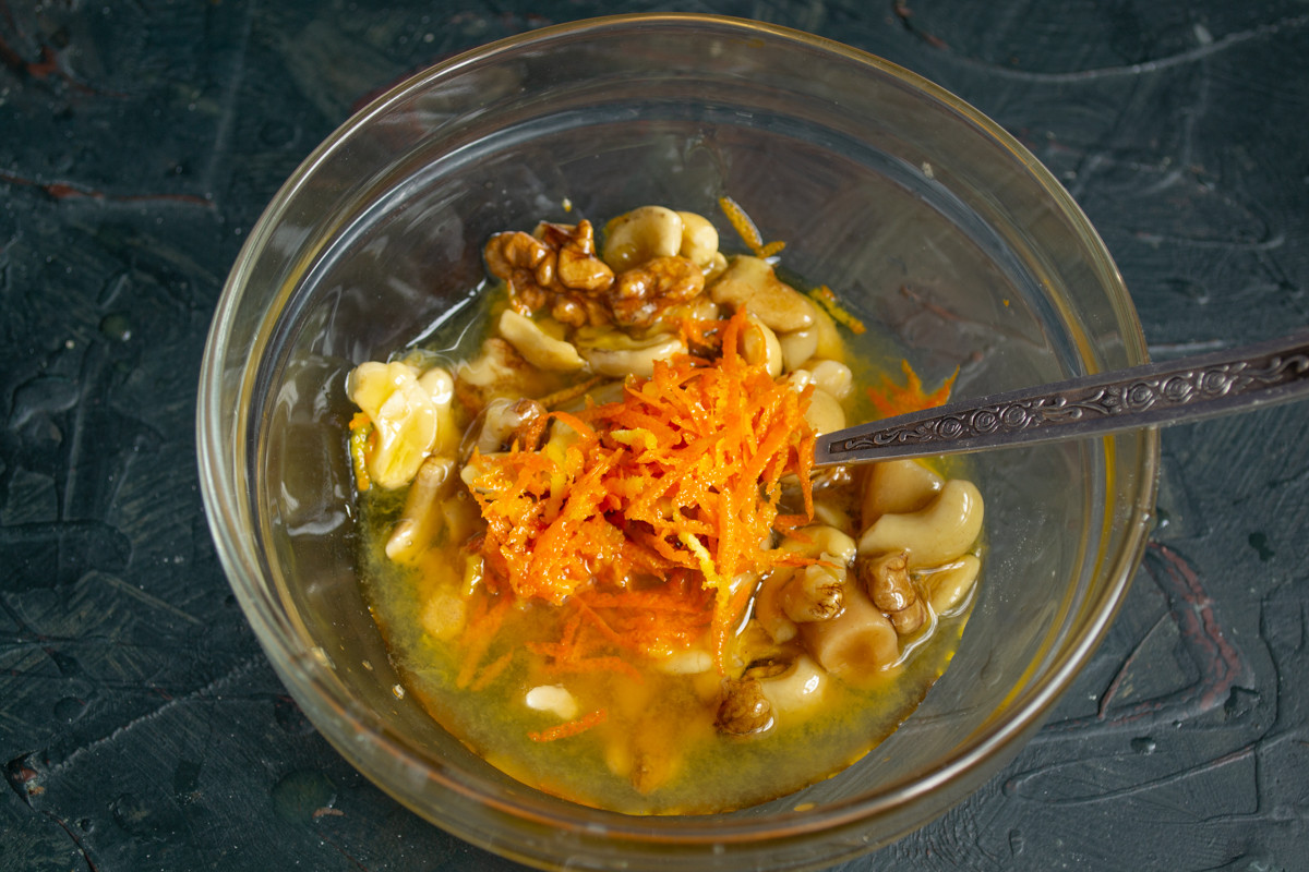 Делаем начинку. Смешиваем в миске обжаренные орехи, мёд. Выжимаем сок из небольшого апельсина. Начинка должна быть густой, понадобится 2-3 столовые ложки сока. Небольшую горстку орехов откладываем в сторону.