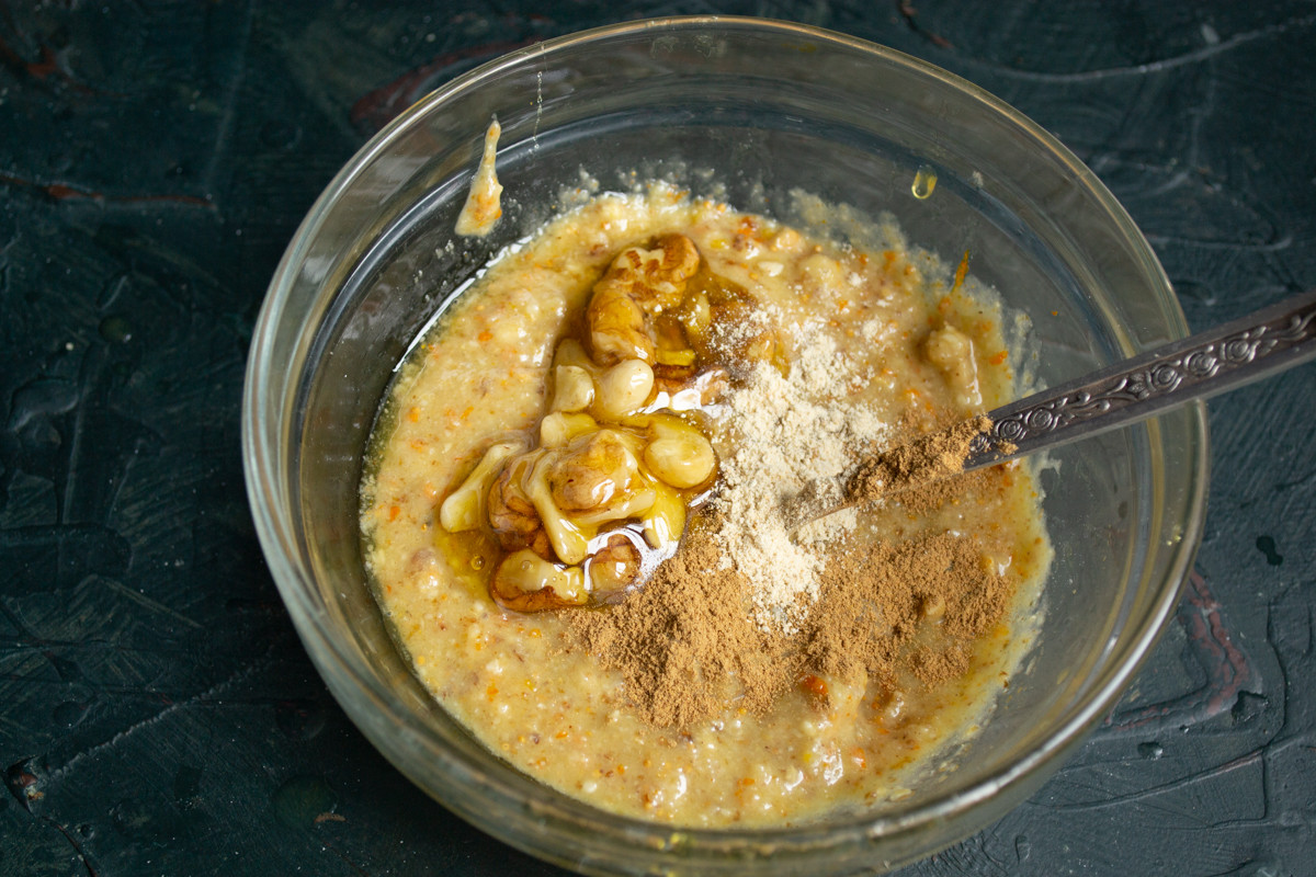 Измельчаем начинку в блендере, добавляем имбирный порошок и молотую корицу, насыпаем горстку целых орешков.