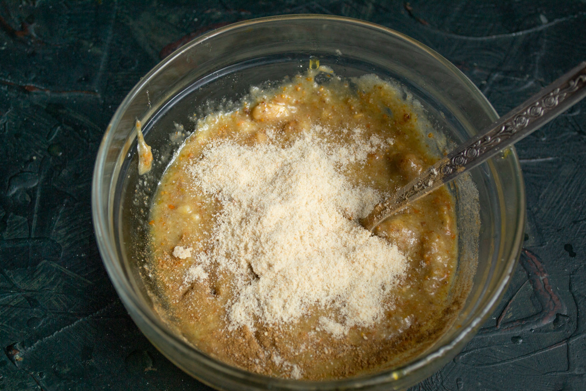 Насыпаем молотые сухари, перемешиваем. Если начинка получилась густой, то пропустите этот шаг рецепта или добавьте только половину столовой ложки молотых сухарей. Ещё начинку можно проварить на тихом огне 10-15 минут, чтобы выпарить влагу, но сухари решают эту проблему быстрее.