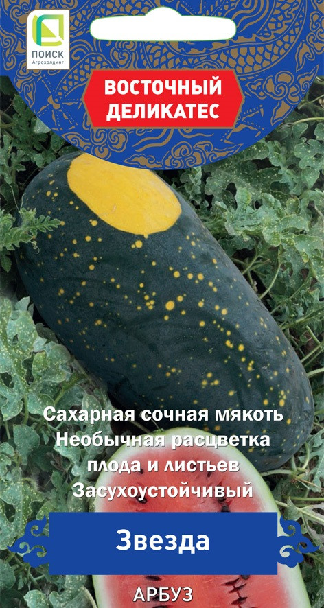 «Звезда» – cорт среднеспелый, обладает крупными плодами цилиндрической формы массой до 18 кг. Мякоть ярко-красная. Кора с необычным рисунком – на тёмно-зелёном фоне размещено одно крупное жёлтое пятно и множество мелких жёлтых пятен. Мелкие ярко-жёлтые пятна присутствуют и на листьях растений, что делает кусты арбуза весьма декоративными. Сорт предназначен для приусадебного и дачного использования, но может употребляться и для промышленного производства, так как является холодостойким и засухоустойчивым. Урожайность на богаре – 15-25 т/га.