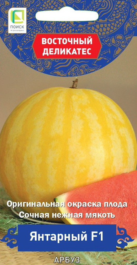 «Янтарный F1» – ранний гибрид для открытого грунта. Плоды круглые, со средней массой – 3 кг. Цвет арбуза жёлтый с тёмно-жёлтыми полосами. Толщина кожуры – 0,5 см. Мякоть красная. Вкус отличный, содержание сахара – 13%. Жаростойкий гибрид.
