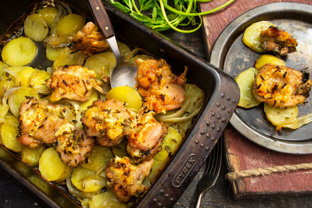Простое и очень вкусное блюдо к Новому году, которое легко приготовить в одной посуде. Готовим курицу, запеченную с картофелем и приправленную ароматными травами. В этом рецепте куриные бедра, мясо этой части курицы лучше подходит для запекания.