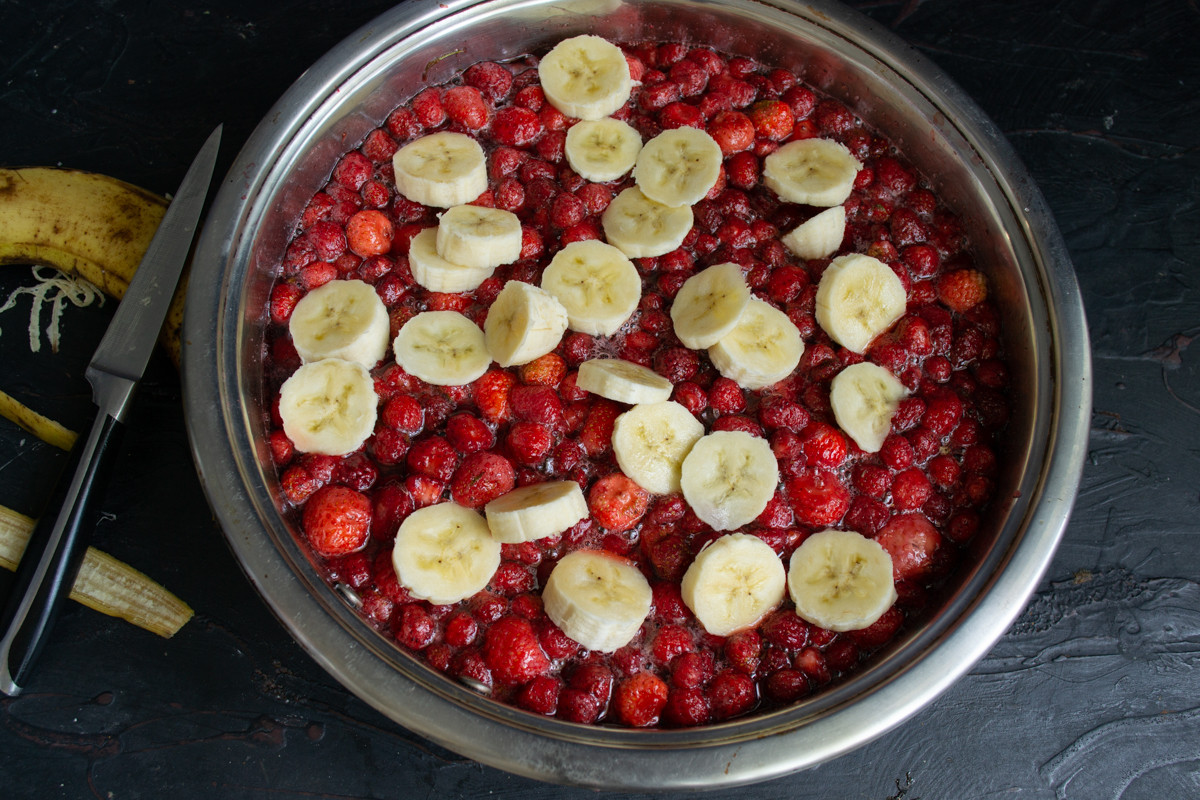 Через 12 часов нарезаем спелый банан небольшими кружочками. Добавляем нарезанный банан к ягодам, нагреваем до кипения на небольшом огне, варим 10-12 минут. Перезрелый или очень спелый банан легко разварится, плотный и чуть недозрелый лучше натереть на тёрке, так он приготовится одновременно с ягодами.