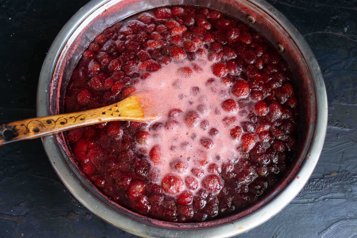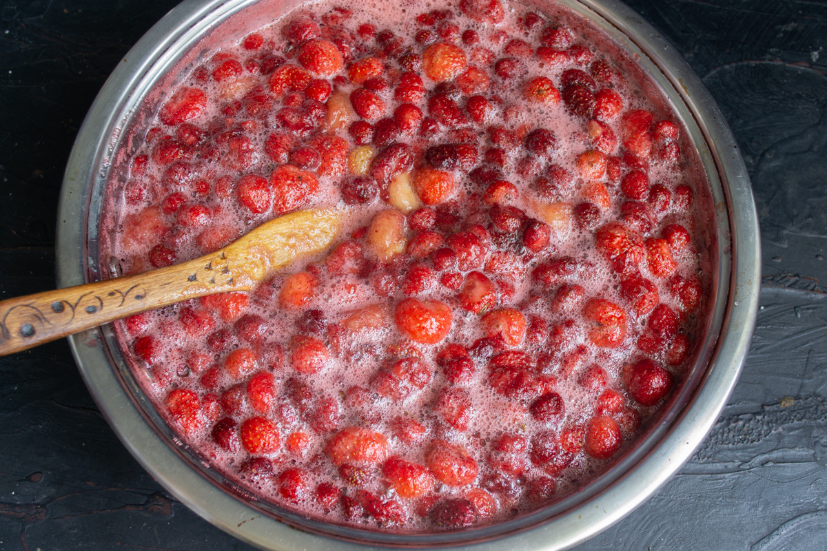 На этом этапе варенье обильно пенится, слегка уменьшаем нагрев, чтобы пена опала. Земляника ягода нежная, если кипятить долго, то она превратится в пюре, поэтому следите за вареньем.