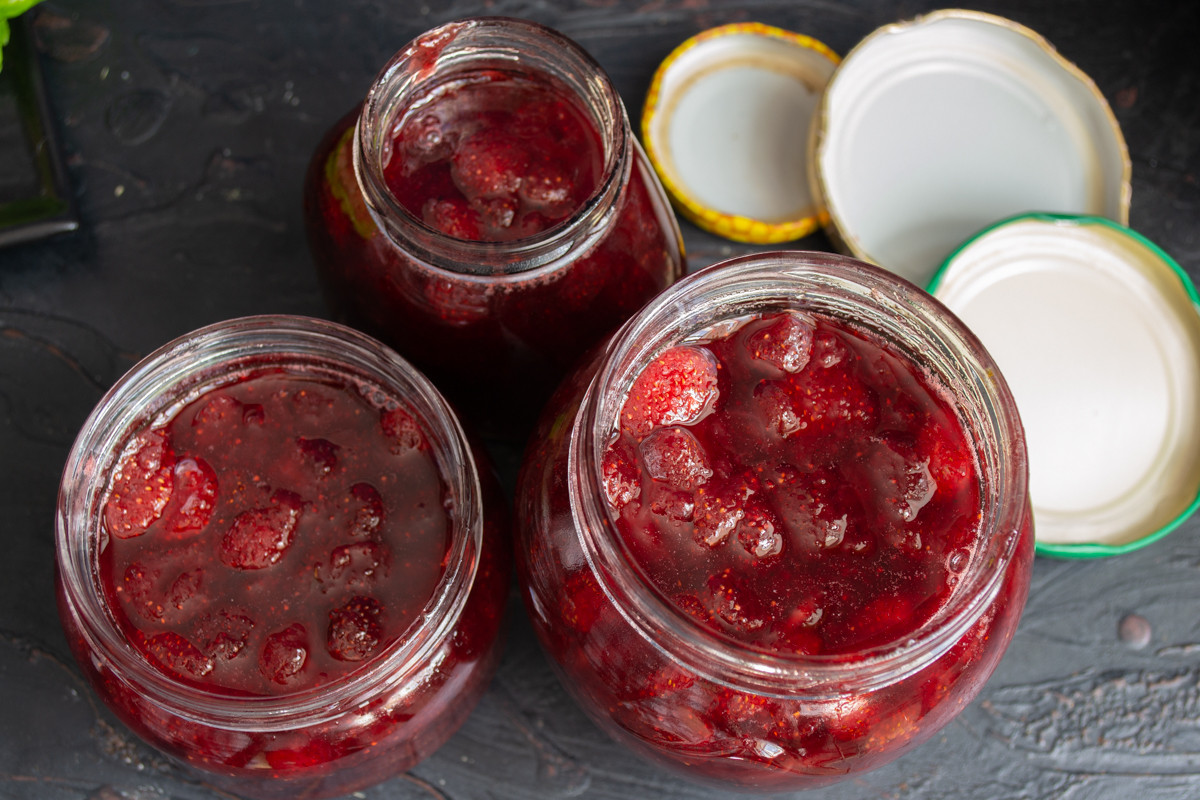 Банки для заготовки тщательно моем тёплой водой с содой, ополаскиваем кипятком. Ставим банки на решетку вверх дном, нагреваем духовку до 100 градусов, сушим банки 10 минут. Разливаем горячее варенье из земляники с бананом и мёдом в банки, заполняем по плечики. Закрываем прокипяченными крышками, убираем на хранение в холодильник. Для заготовки на зиму в ёмкость для стерилизации кладём полотенце, ставим банки, вливаем горячую воду. Нагреваем до 80-85 градусов по Цельсию, пастеризуем 15 минут. Если вода начинает закипать, нужно влить немного холодной воды, чтобы погасить кипение.