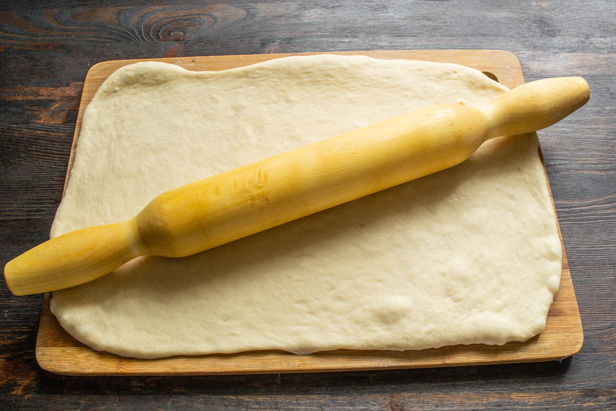 Тесто делим пополам. Половину теста раскатываем на присыпанной мукой доске в тонкий пласт размером примерно 30х40 сантиметров. Также раскатываем оставшееся тесто.