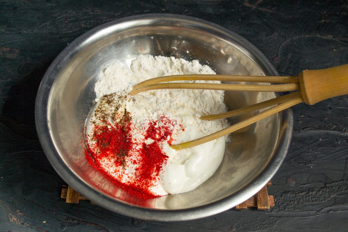 Готовим подливку для жареных лисичек. Смешиваем венчиком сметану, пшеничную муку, молотую сладкую паприку, соль и черный перец.
