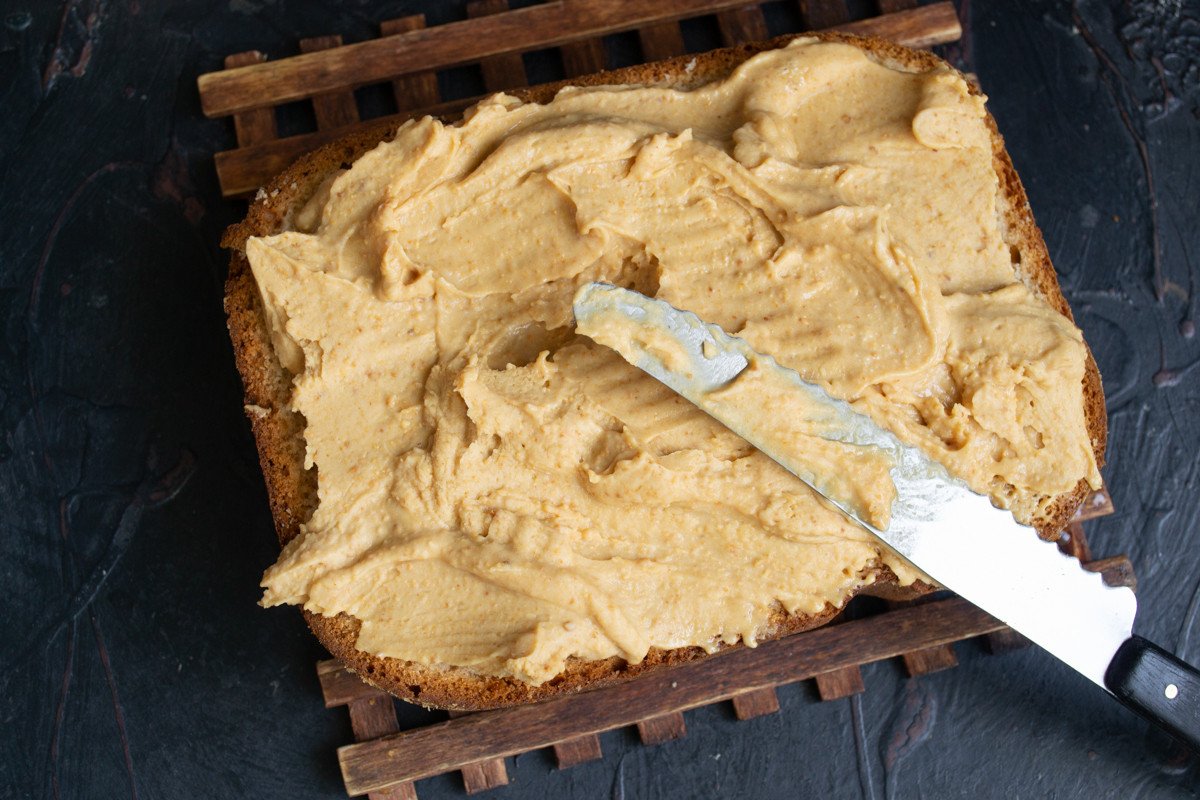 Намазываем арахисовую пасту на половинку хлеба, накрываем второй половинкой и убираем в холодильник, чтобы паста хорошо застыла. Поскольку в арахисовую пасту мы добавили сливочное масло, она застынет довольно быстро, получится вкусный масляный крем с ореховым вкусом.