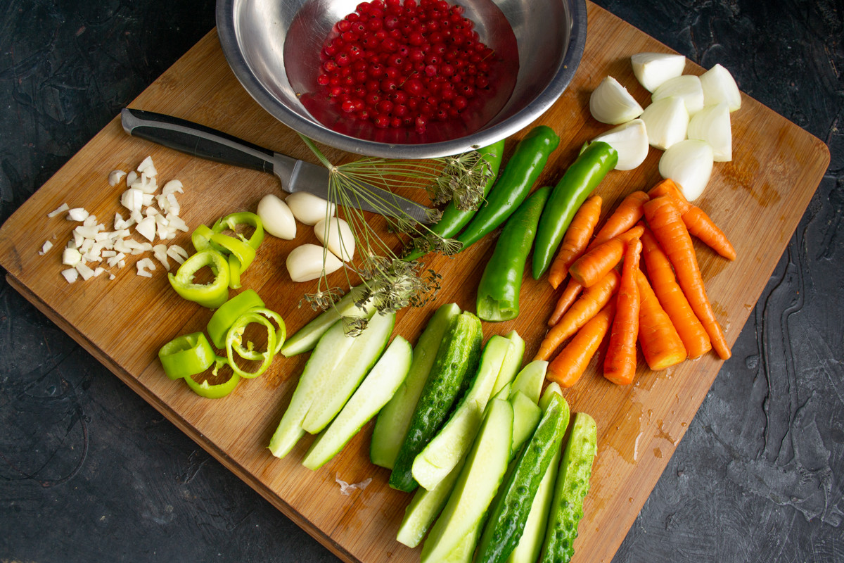 Подготовим овощи. В литровую банку уместится примерно 5 средних огурцов и 10 мелких морковок, плюс лук, чеснок, перец и смородина. Овощи тщательно моем, ополаскиваем фильтрованной водой. Небольшие пупырчатые огурцы разрезаем вдоль на четыре части. Мелкую молодую морковь моем мочалкой с абразивом, обрезаем с двух сторон. Стручки горького перца разминаем между ладонями, срезаем хвостик, вычищаем семена узким ножом. Один стручок нарезаем кольцами. Небольшие луковки разрезаем на четыре части. Чеснок чистим от шелухи, два зубчика режем мелко. Обрываем смородину с веточек, замачиваем в холодной воде.