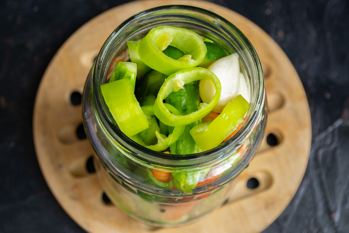 Добавляем бланшированный горький перец, укладываем перец открытой частью вверх.