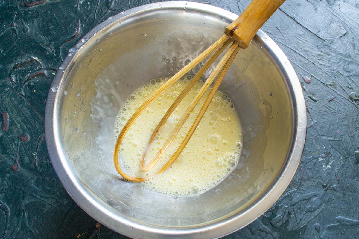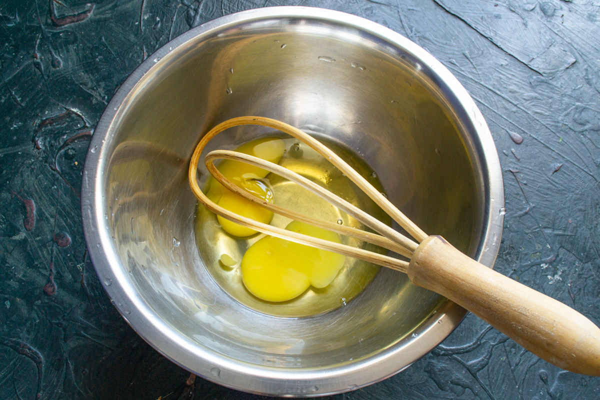 Тем временем подготовим яичную смесь. Разбиваем в глубокую миску свежие куриные яйца. Смешиваем венчиком.