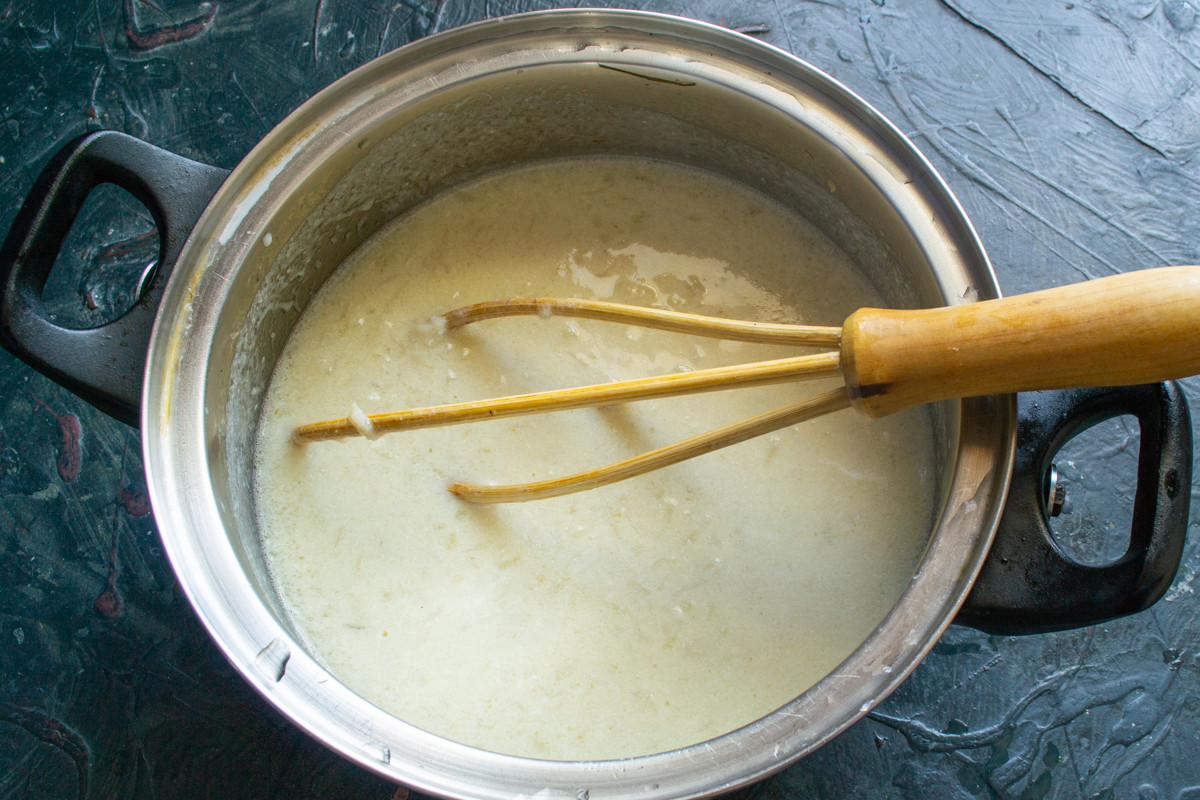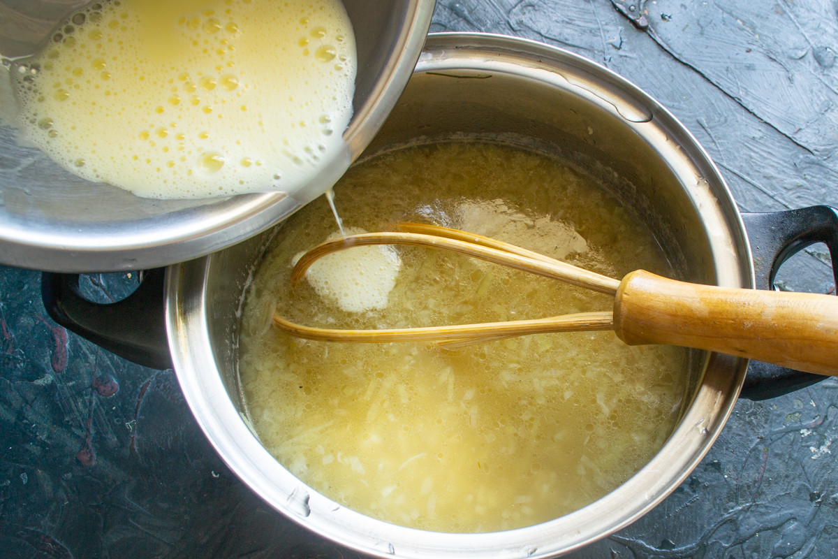 Самый важный момент приготовления – нужно соединить яйца и кипящий бульон. Если влить яичную смесь сразу, то яйца свернутся, и добиться кремовой консистенции не получится. Делаем так: суп должен кипеть еле-еле. В одну руку берем венчик, в другую миску с яичной смесью. Тонкой струйкой вливаем яйца, постоянно помешивая супчик венчиком.
