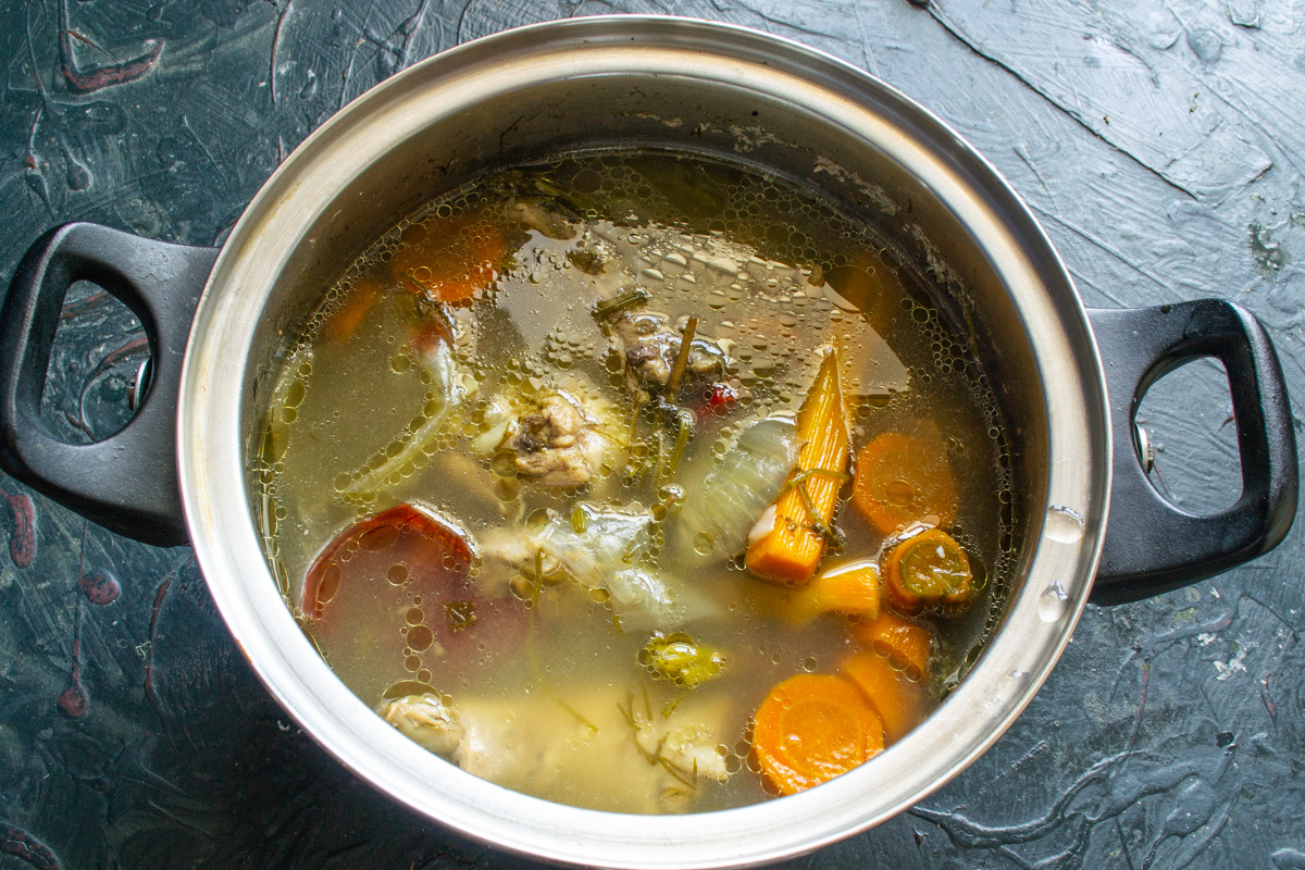 Вливаем в кастрюлю процеженный куриный бульон. Снова нагреваем суп до кипения, солим, перчим по вкусу. Готовим 15 минут.