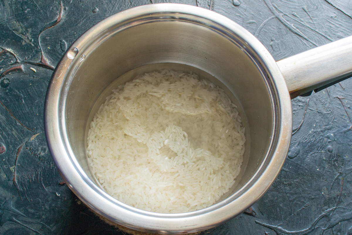 Рис промываем холодной водой. Кладём промытую крупу в сотейник, вливаем 200 мл холодной воды. После закипания уменьшаем нагрев. Готовим 15 минут на тихом огне. В этом рецепте можно использовать орзо – мелки макаронные изделия по форме похожие на зернышки ячменя или риса.