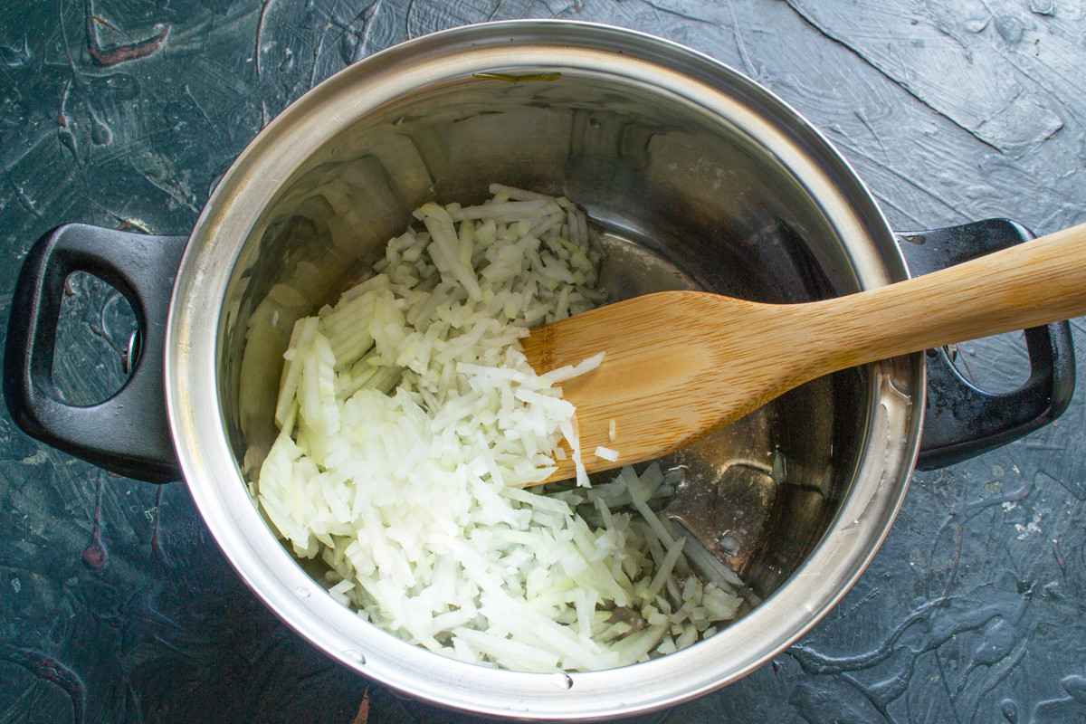 В кастрюлю с толстым дном наливаем оливковое масло. Репчатый лук режем мелко. Бросаем нарезанный лук в кастрюлю, посыпаем щепоткой соли. Обжариваем на небольшом огне 7 минут.
