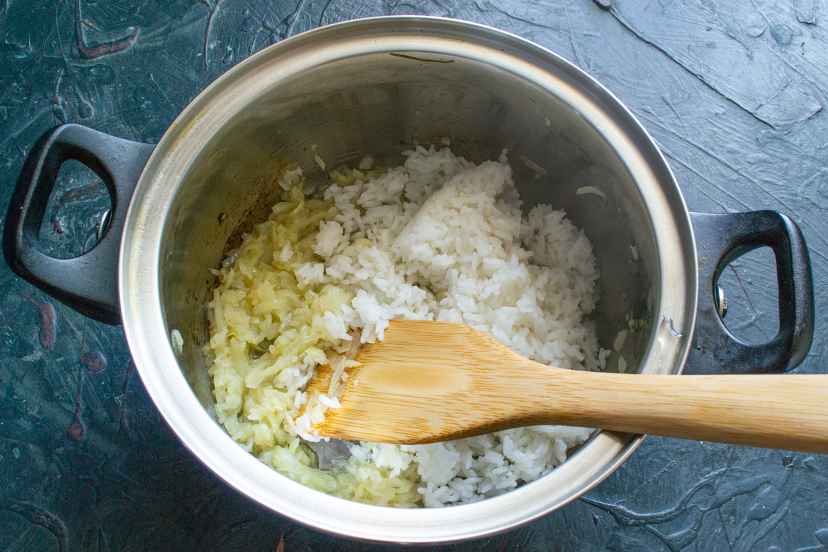 К обжаренному луку добавляем вареный рис. Рис может быть слега недоваренным, у него будет время дойти до готовности.