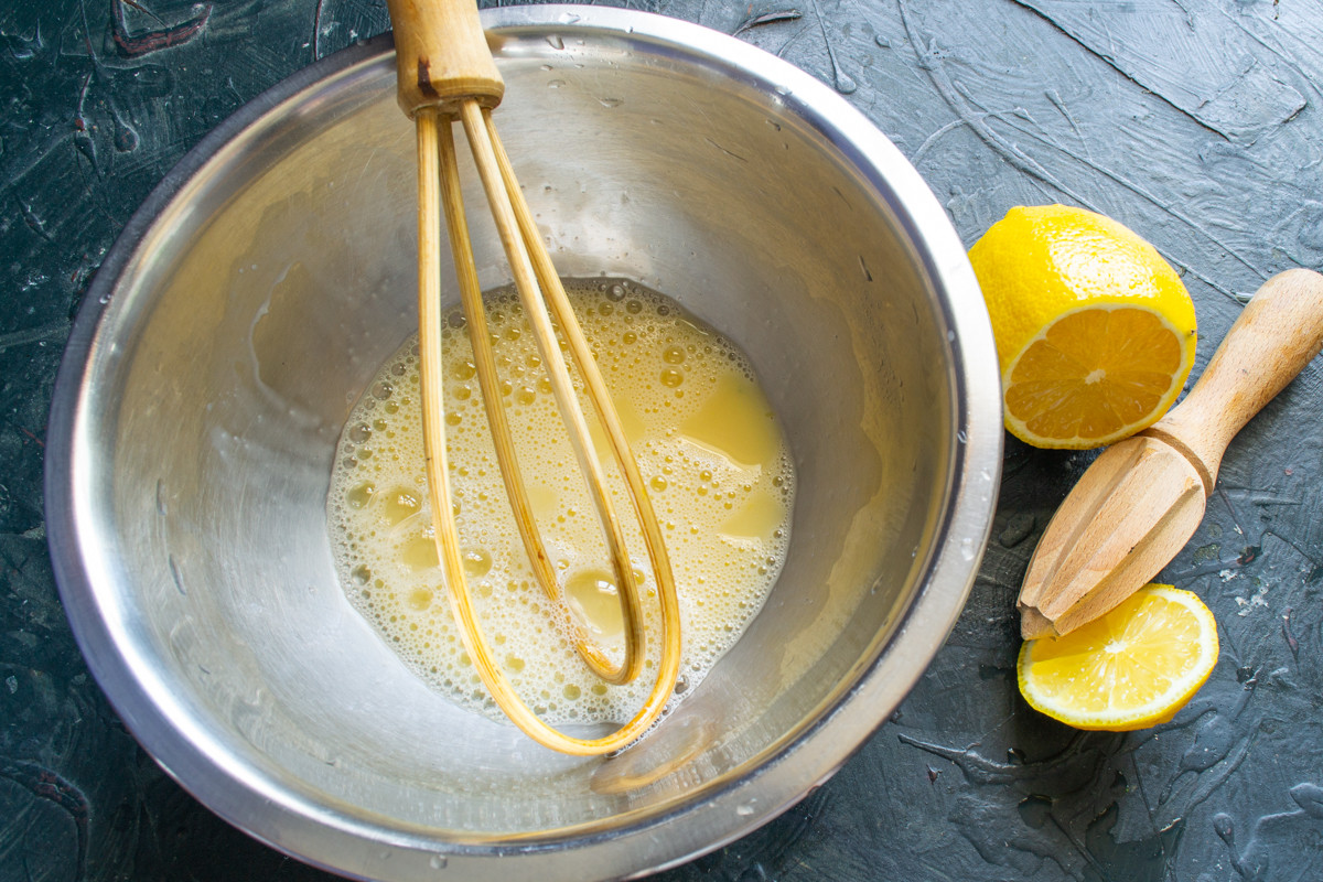Хорошо взбиваем яйца с лимонным соком, чтобы получилась однородная эмульсия.