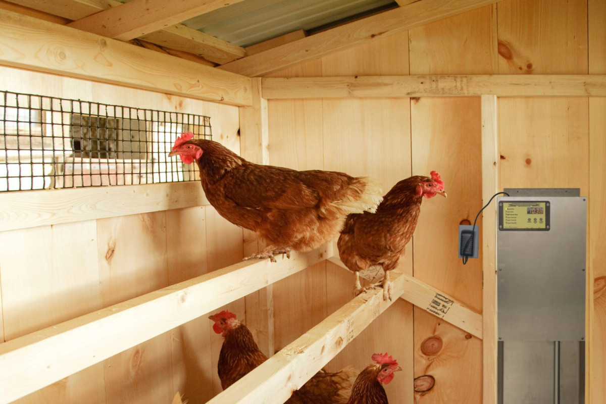 Чтобы создать для кур режим прогулок, их необходимо выпускать на улицу в одно и то же время. Здесь могут помочь пульты дистанционного управления и автоматические системы с таймером. Благодаря им можно открывать дверцу на выгул прямо из дома, либо просто установить нужное время на таймере и предоставить управление автоматике.