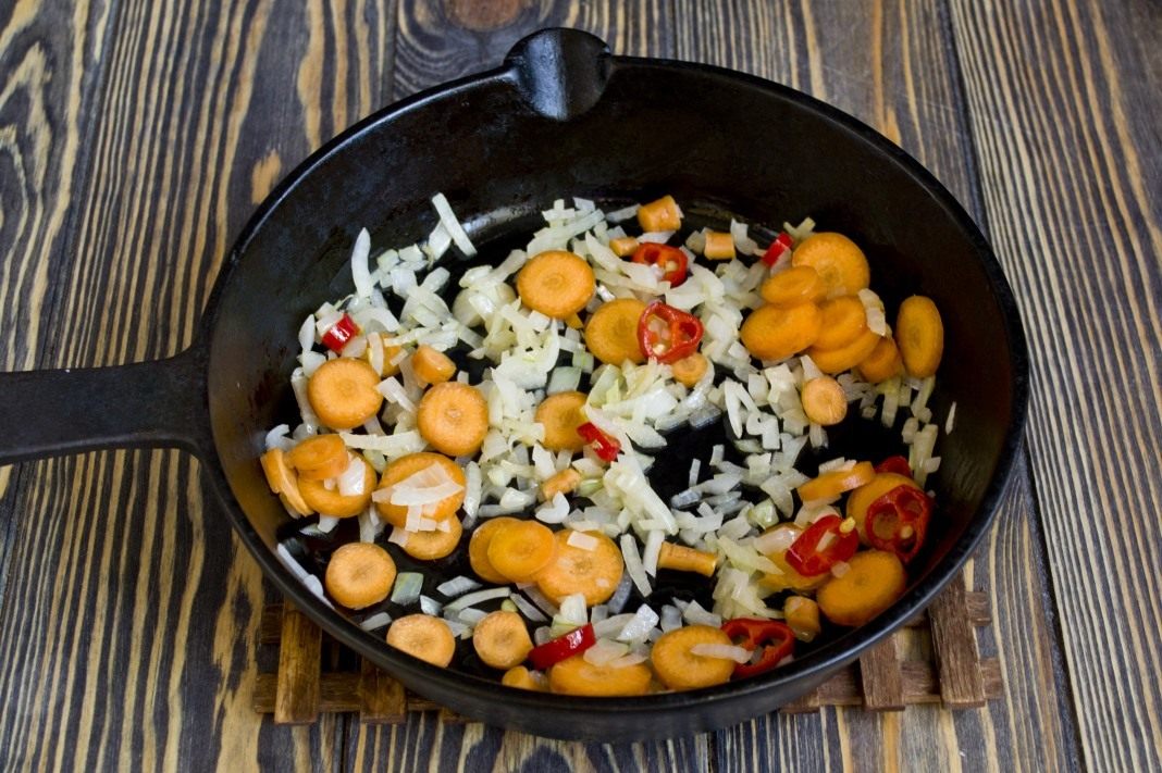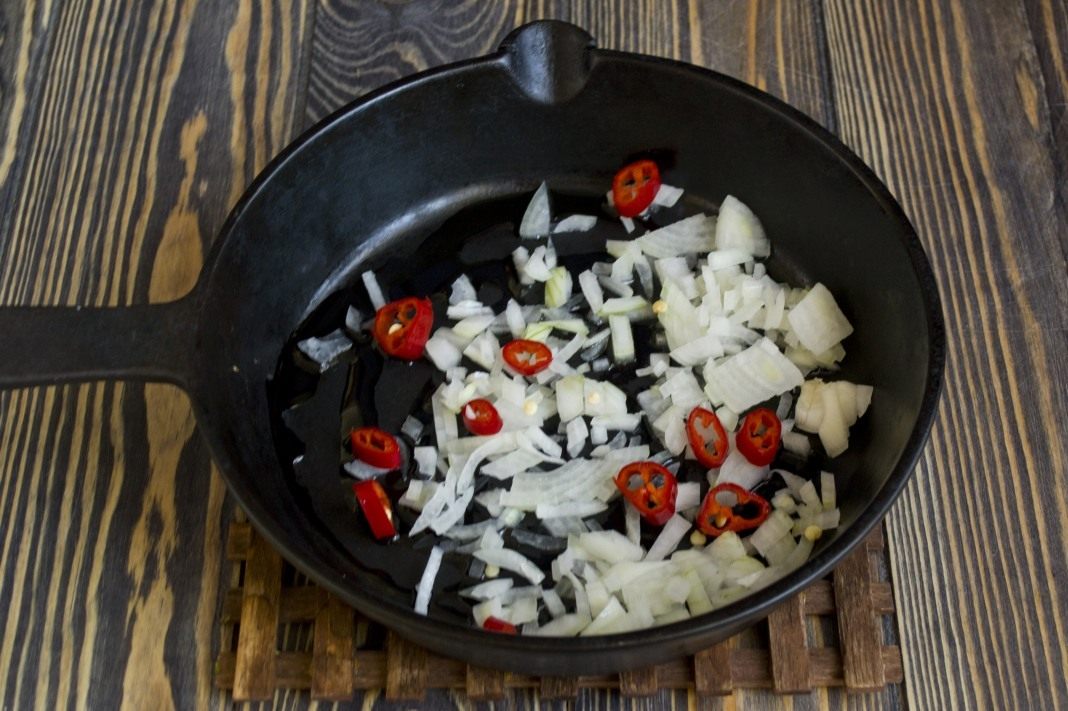 Следом отправляем нарезанные кольцами стручки горького перца, которые, в зависимости от степени жгучести, можно очистить от семян и мембраны.