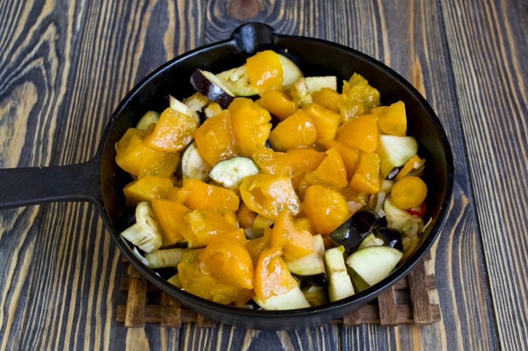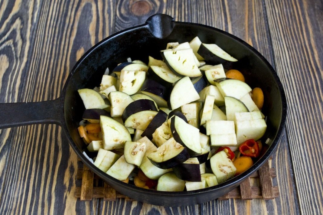Спелые баклажаны нарезаем ломтиками толщиной около 1 сантиметра. Затем каждый кружок режем на 4 части, бросаем к пассерованным овощам.