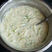 Смешиваем тёртый кабачок с тестом, оставляем на 10 минут.