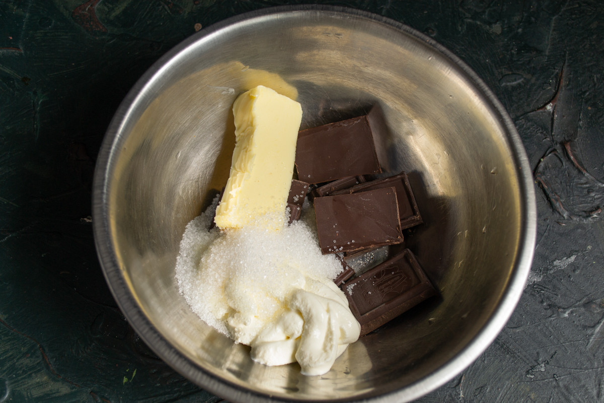 Делаем топинг для десерта. В глубокую миску кладём разломанную на кусочки плитку горького шоколада, добавляем сахарный песок, сливочное масло и жирную сметану. нагреваем ингредиенты на водяной бане или в микроволновке. Хорошо перемешиваем, получится очень вкусный и густой ганаш, который не застынет, как шоколадка.