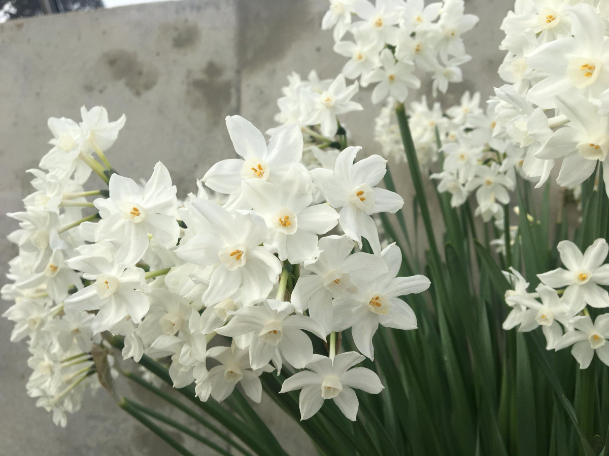 На каждом цветоносе в мае — июне, распускаются более 10 нежно-белых цветков у нарцисса бумаговидного сорта «Зива» (Narcissus papyraceus ‘Ziva’). Он более теплолюбив и легко выращивается в помещении. Обладает сильным ароматом.