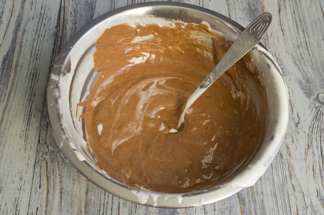 В оставшееся тесто насыпаем какао, бережно перемешиваем, чтобы не разрушить пузырьки воздуха, образовавшиеся в процессе взбивания яиц.