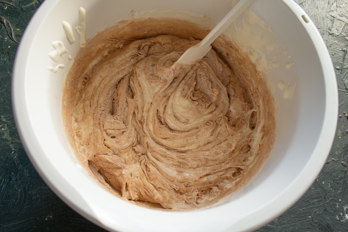 Небольшими порциями насыпаем на взбитые яйца муку с какао. Круговыми движениями перемешиваем, стараясь сохранить пышность. На этом этапе смешивать только вручную, миксер использовать не советую.