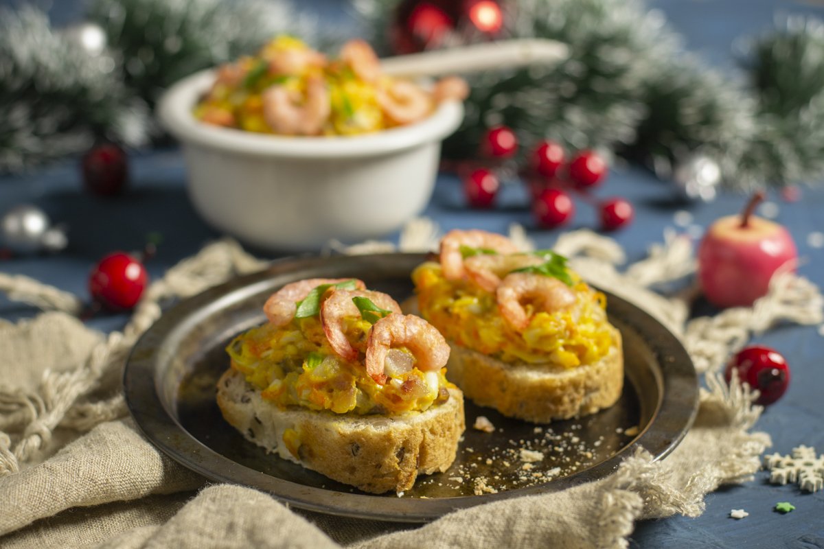 Способ приготовления брускетт с креветками и селёдочным салатом