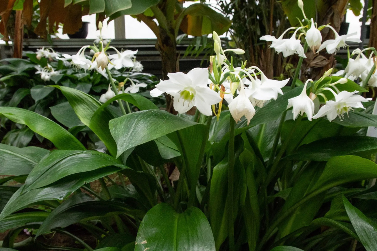 Эухарис, или «амазонская лилия» известна глянцевыми темно-зелеными листьями и ароматными белыми цветками, по форме похожими на нарциссы. Родом она из Южной Америки, что объясняет ее второе название.