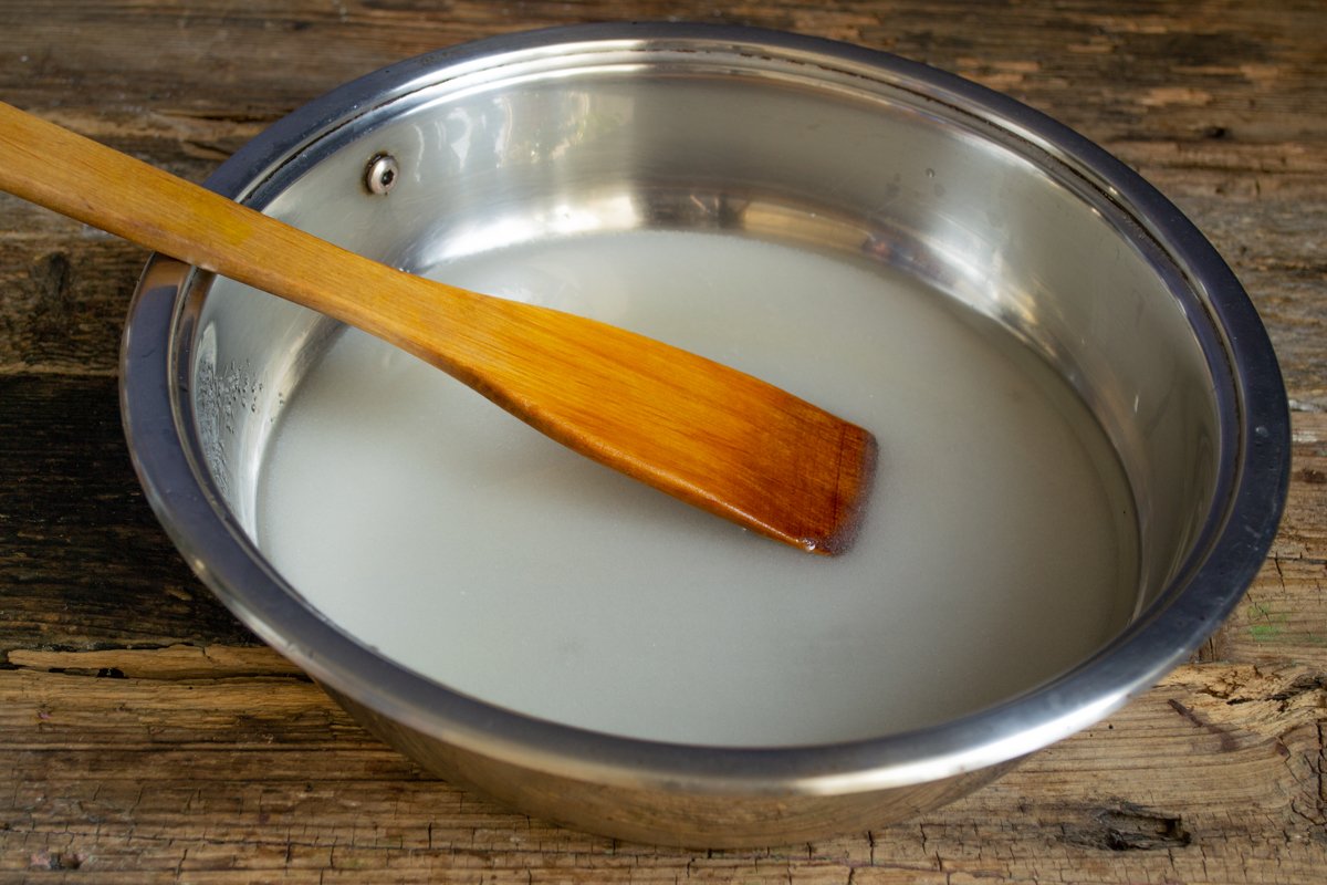 После закипания сироп начинает сильно пениться, сахар растворяется и сироп становится прозрачным. Когда пена осядет и кипение станет равномерным, можно загружать фрукты и ягоды. Не нужно варить сахарный сироп для варенья долго, достаточно 4-5 минут.