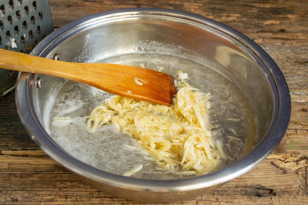 Бананы очищаем, натираем на крупной тёрке. Кладём тёртые бананы в кипящий сироп. Очищенные и натёртые бананы на воздухе темнеют, поэтому готовьте фрукты непосредственно перед загрузкой в сироп.