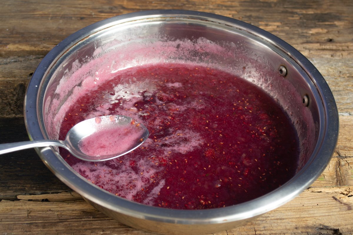 Аккуратно перемешиваем и быстро доводим быстрый джем до кипения, кипятим 3 минуты на сильном огне. В это время снова появится обильная пена. Сначала джем по цвету будет пёстреньким, постепенно малина и земляника выделят сок и всё окрасится в темно-розовый цвет. Если не переваривать, то сохранится и красивый цвет, и большинство полезных веществ.
