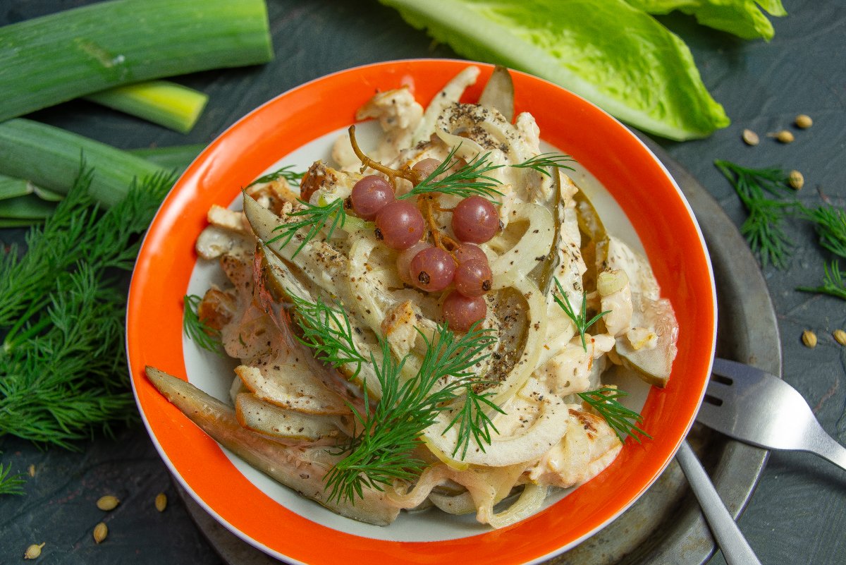 Готовим куриный салат за 5 минут из жареного куриного филе, маринованных огурцов и лука — салат «Чезаре». Кстати, с салатом «Цезарь» ничего общего, только название похоже. Салатик такой быстрый и вкусный, что его можно в буквальном смысле доделывать, когда гости уже за столом и просят добавку. Кусочек куриного филе толщиной сантиметра полтора нужно жарить на хорошо разогретой сковороде по две минуты с каждой стороны. Этого времени вполне достаточно для готовки, так мясо останется сочным. Пока жарится курочка, как раз успеем нарезать лук и огурчики. Останется смешать продукты и приправить майонезом. Попробуйте, очень вкусно!