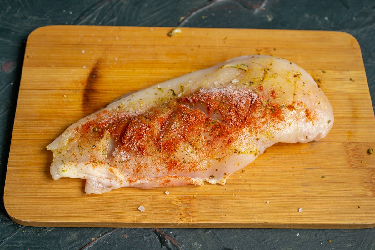 На большом филе из куриной грудки делаем неглубокие надрезы крест-накрест с двух сторон. Грудка идеально подходит для этого рецепта куриного салата, филе бёдер жарится дольше.