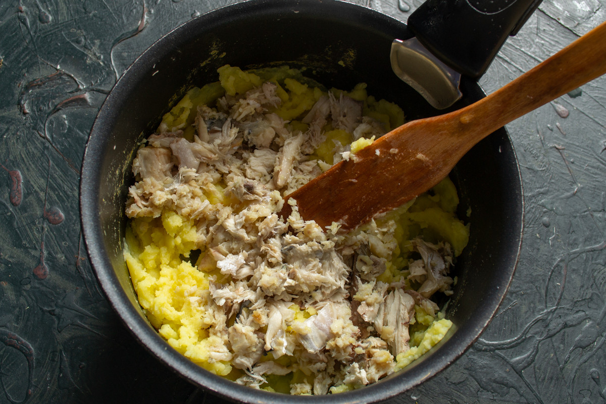 Варёную рыбу рубим ножом или разбираем на небольшие кусочки руками. Добавляем рыбу к картошке.