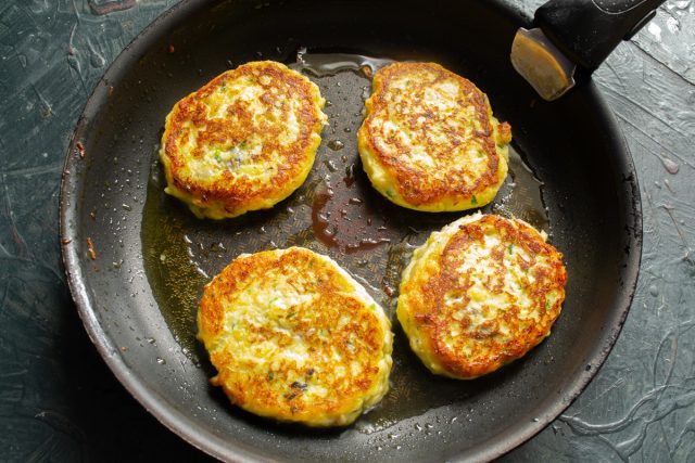 В сковороду с толстым дном наливаем нейтральное растительное масло без запаха, нагреваем. Столовой ложкой выкладываем тесто в разогретое масло. Жарим до золотистого цвета на небольшом огне. Все ингредиенты теста кроме яиц уже готовы, поэтому времени на жарку нужно совсем немного.
