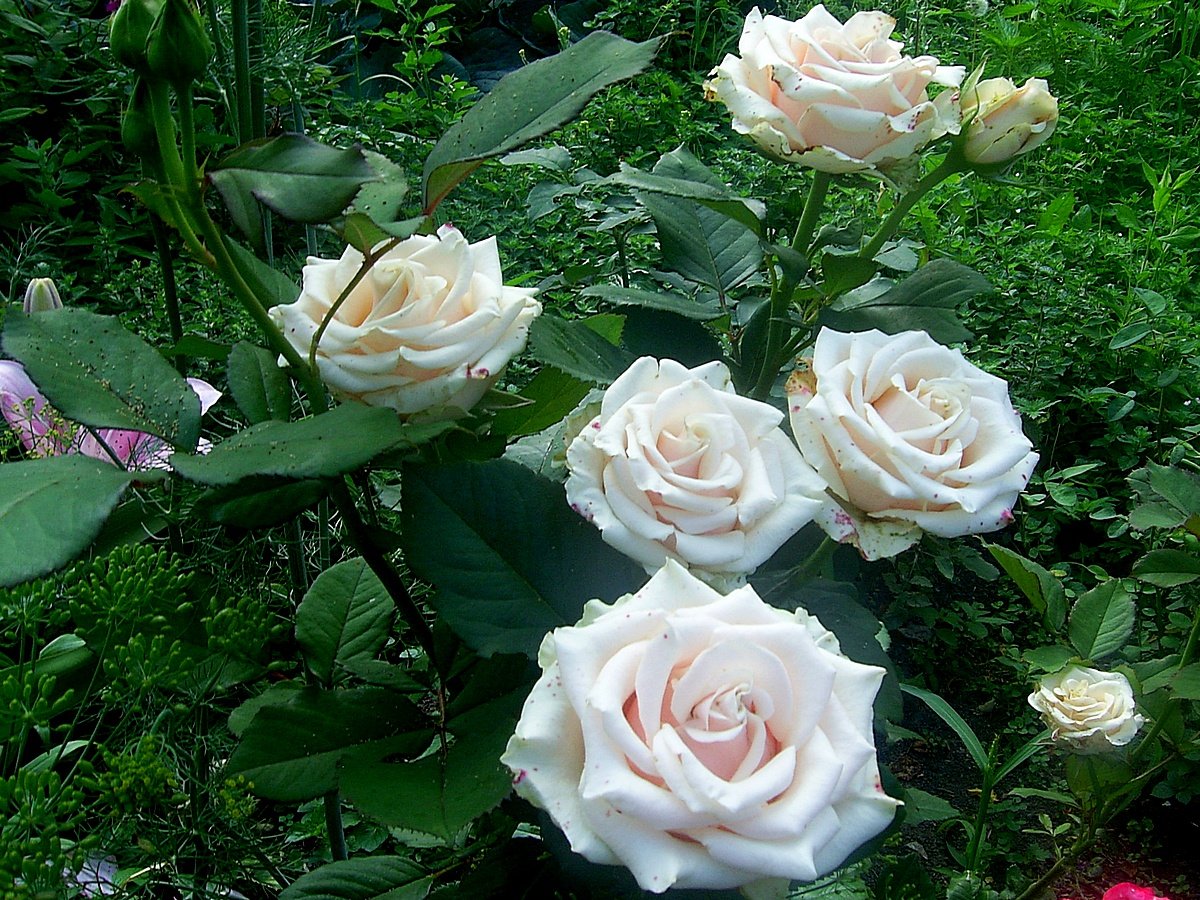 Белые розы «Мемори» (Memory), «Пьер Ардити» (Pierre Arditi) настолько хороши формой, цветом, махровостью, долгоцветением и ароматом, что, загубив их на Дальнем Востоке, посадила на Кубани. Здесь им хорошо. Но севернее Воронежа это будут довольно проблемные растения — для обильного повторного цветения им нужен длинный тёплый период. От дождей, как большинство светлых роз, становятся «конопатыми».