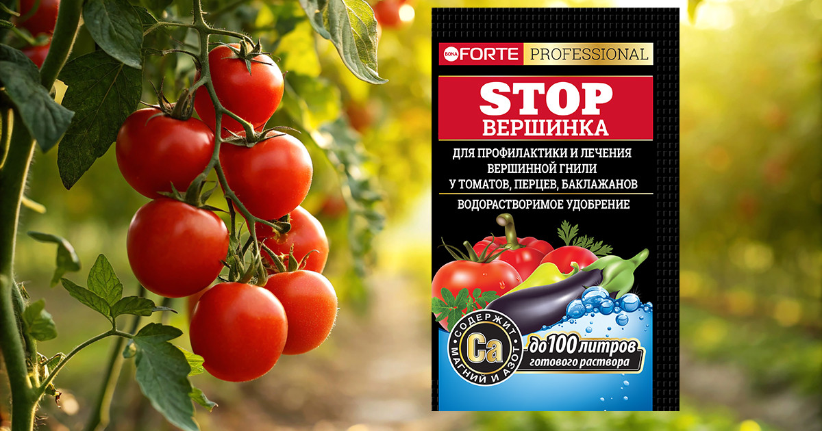 Использование калийного удобрения для томатов в чрезмерном количестве провоцирует дефицит в тканях растения кальция. Он, в свою очередь, становится причиной развития вершинной гнили. От этой напасти поможет защититься, а в случае уже появившейся проблемы — и избавиться удобрение водорастворимое STOPвершинка, 100 г Bona Forte. Средство улучшает усвоение культурой калия, способствует поглощению ею фосфора, стимулирует фотосинтез, повышает устойчивость растения к заболеванию.