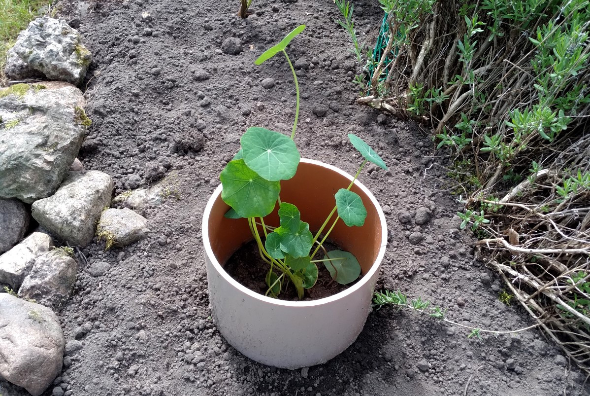 После строительства дома у нас остались пластиковые трубы большого диаметра. Мы нарезали их на куски, высотой 30 см. Получилось незаменимое приспособление для защиты декоративных растений. Обрезки труб надежно защищают молодую рассаду от повреждений ветром и притеняют невысокие растения от солнца.