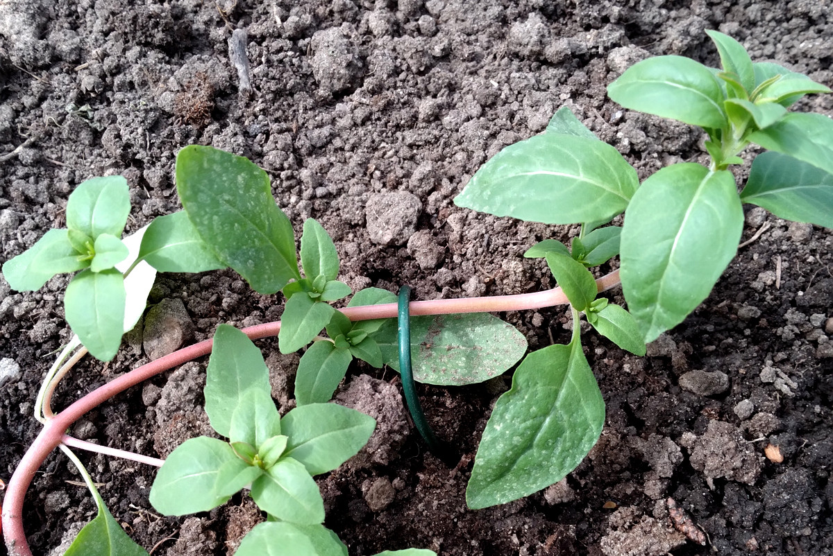 Нескольким кустам годеции обрезков труб не хватило. Выручили самодельные шпильки. Длинные ветви годеции пришпилила к земле, и она благополучно пережила несколько дней ветреной погоды.