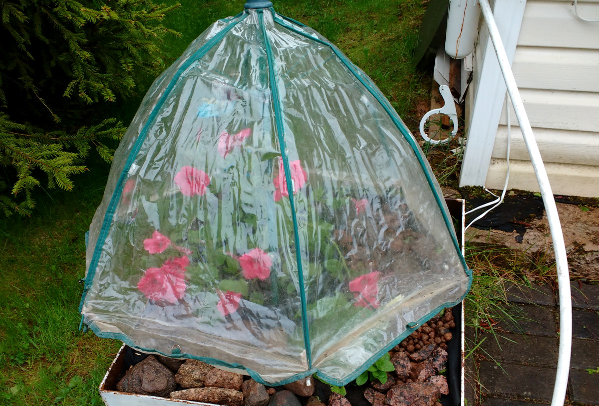 Изначально мы сделали такие ящики из остатков поликарбоната на деревянном каркасе для молодых роз, как укрытие на зиму. Одна сторона у них отсутствует для проветривания. Такая конструкция пропускает свет и сохраняет тепло. Они обеспечивают защиту растений от ветра, холода, предохраняют от вымокания.