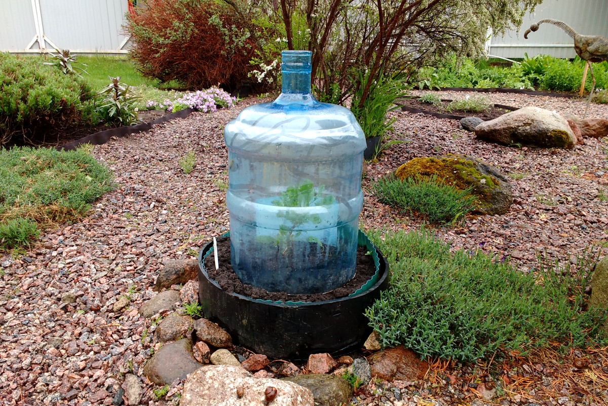 Пятилитровые канистры также можно использовать. Но они легкие, ветер их нередко сносит. Большие бутыли просторнее, тверже, крепче фиксируются в земле. Их размера достаточно, чтобы укрыть при холодной погоде кустики рассады капусты или цветов. При сильном похолодании на бутыли можно накинуть укрывной материал как на каркас. А еще они надежно защищают молодые растения от улиток и слизней.