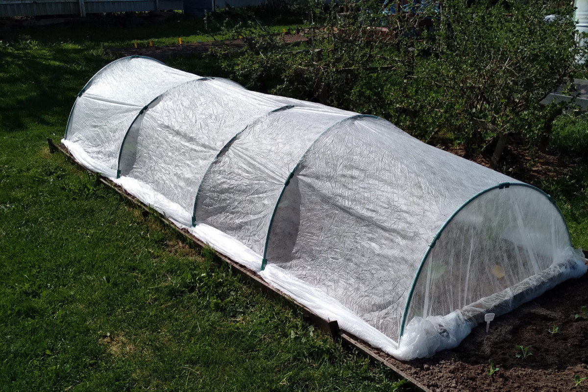 Простые парнички легко собираются из укрывного материала, садовых дуг и зажимов. Оптимальная защита от плохой погоды для всех культур. Главное, надежно закрепить ткань на дугах, а сам парник на земле. Если дуг не хватает, то «одноразовый» парник можно собрать из деревянных реек, при этом ткань на дереве быстро закрепляется строительным степлером.
