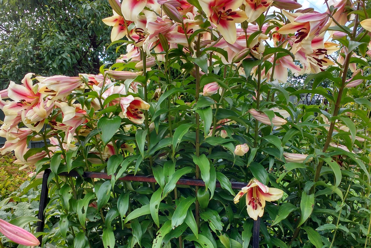 У меня растут двухметровый дельфиниум и лилии высотой 1,5 метра. На пару метров раскинулась старая кустовая роза. Без крепкого ограждения было бы невозможно избежать поломок, сохранить как декоративность, так и целостность кустов при ливнях и резком ветре. Для изготовления опор необходимы металлические пруты или уголки, а также сварочный аппарат с умелым человеком. Затем конструкцию можно покрасить в любой цвет.