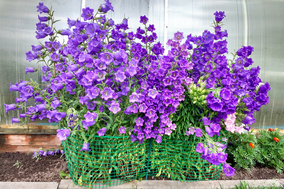 В саду сетчатая опора смотрится органично и ненавязчиво. Симпатично, как в корзинке, выглядят кусты колокольчика, обрамленные в сетчатую опору.